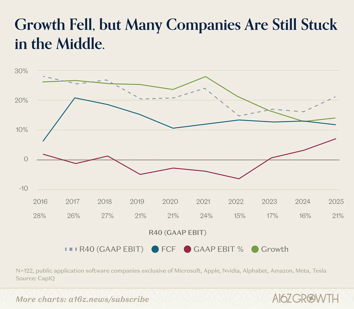 是的,自由现钱流有所改善;GAAP利润率也有所提高。然而,一旦你将股票薪酬视为真正的支出,而不是永久性的豁免,该行业的大部分公司仍然处于艰难的中间地带:增长太慢,不配享有高增长的估值溢价;股权太稀释,不配享有稳定的估值倍数。
