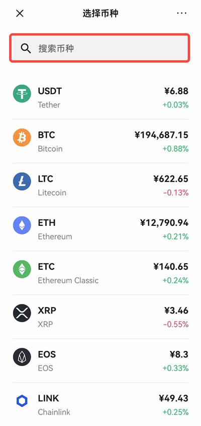 在欧易APP精简版首页底部,找到并点击蓝色【买入】按钮,进入币种选择界面。支持通过右上角功能切换支付币种或查询历史订单记录。