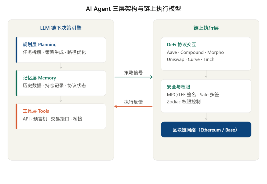 但这里有一点需要明确:AI 模型本身无法直接与区块链交互。几乎所有当前的 DeFAI 系统,都采用链下推理与链上执行分离的架构--AI Agent 在链下完成策略计算,再将结果转化为链上交易信号,由执行模块代为提交。这一架构设计,既是当前技术条件下的现实选择,也由此引出了私钥授权、权限管理等一系列安全议题(详见第五章)。