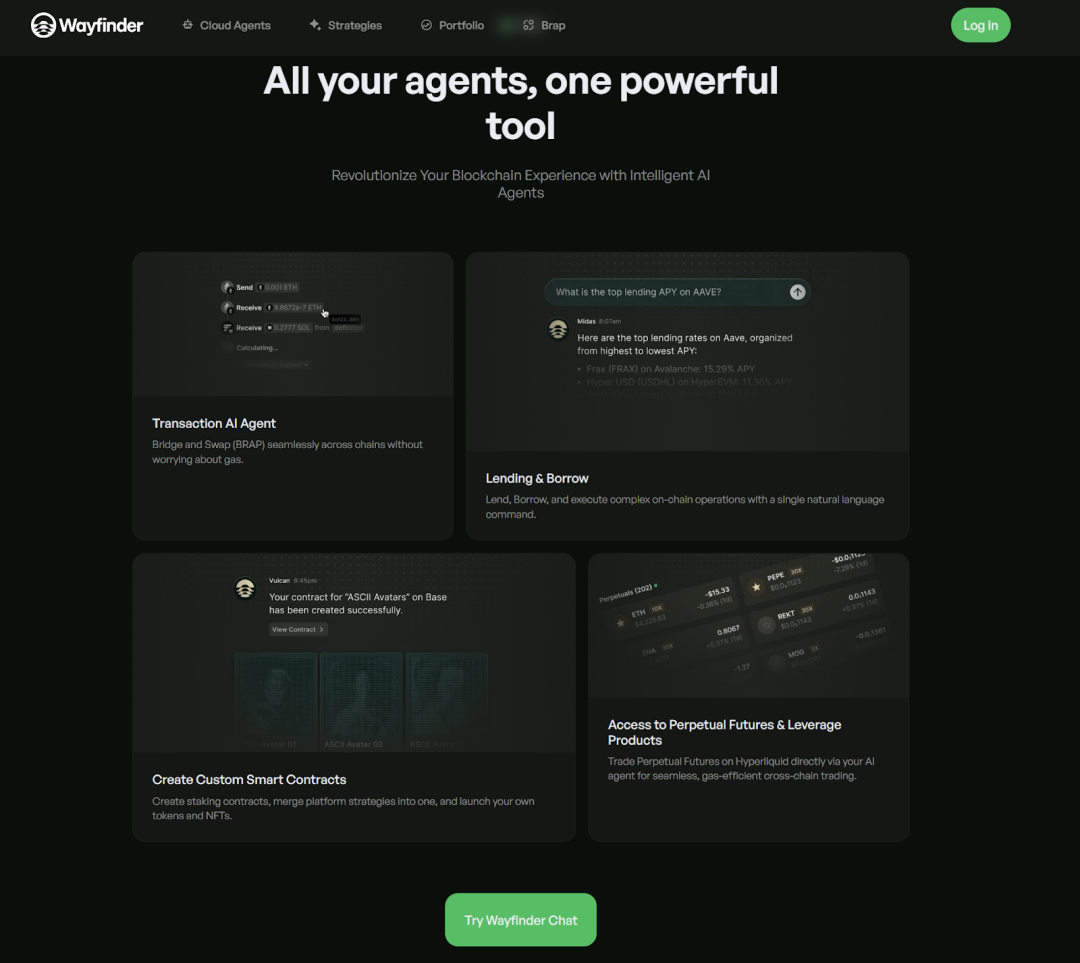 Wayfinder 则由 Paradigm 投资,提供更进一步的全链交易服务。其 AI Agent(称为 Shells)自动寻路不同链间的最优交易路径,执行跨链转账、代币互换或 NFT 交互等操作,用户无需关注底层 gas 费、跨链兼容性等技术细节。