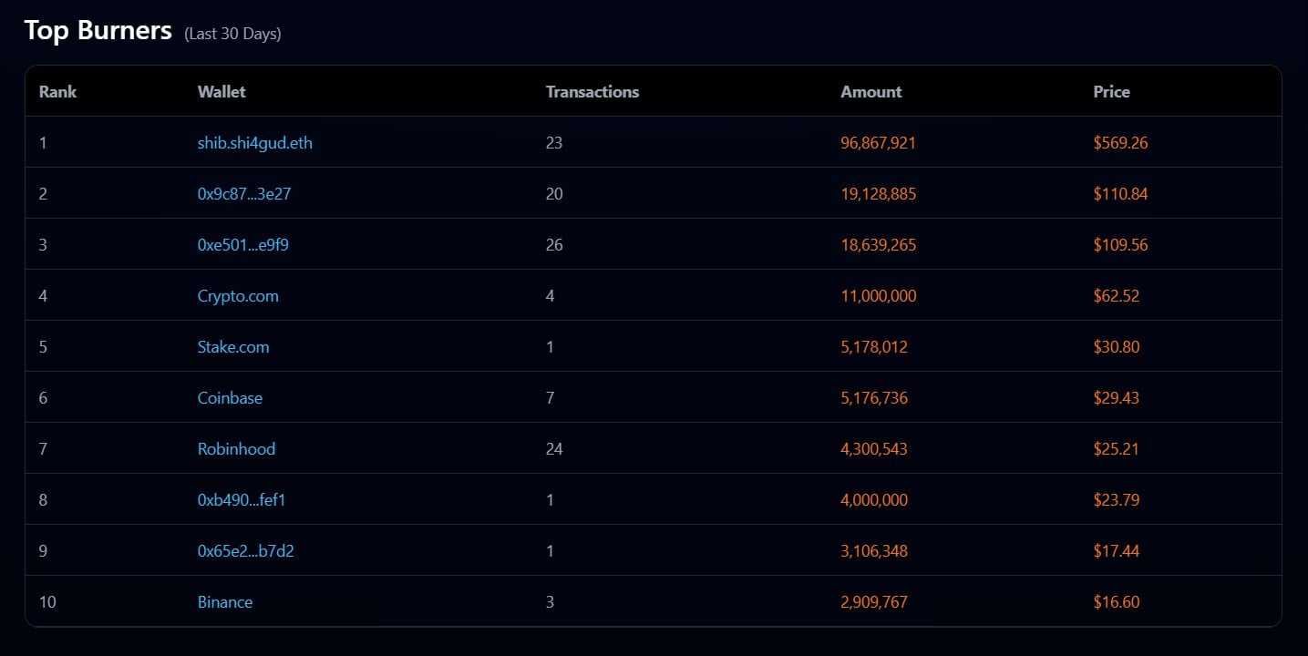 销毁榜单显示,近日最大规模的SHIB销毁行为来自前述平台Robinhood(通过24笔交易销毁4,300,543枚SHIB)和Stake.com(单笔销毁5,178,012枚SHIB)。除它们外,Coinbase(7笔交易销毁5,176,736枚SHIB)、Crypto.com及币安等顶级交易所也赫然在列。