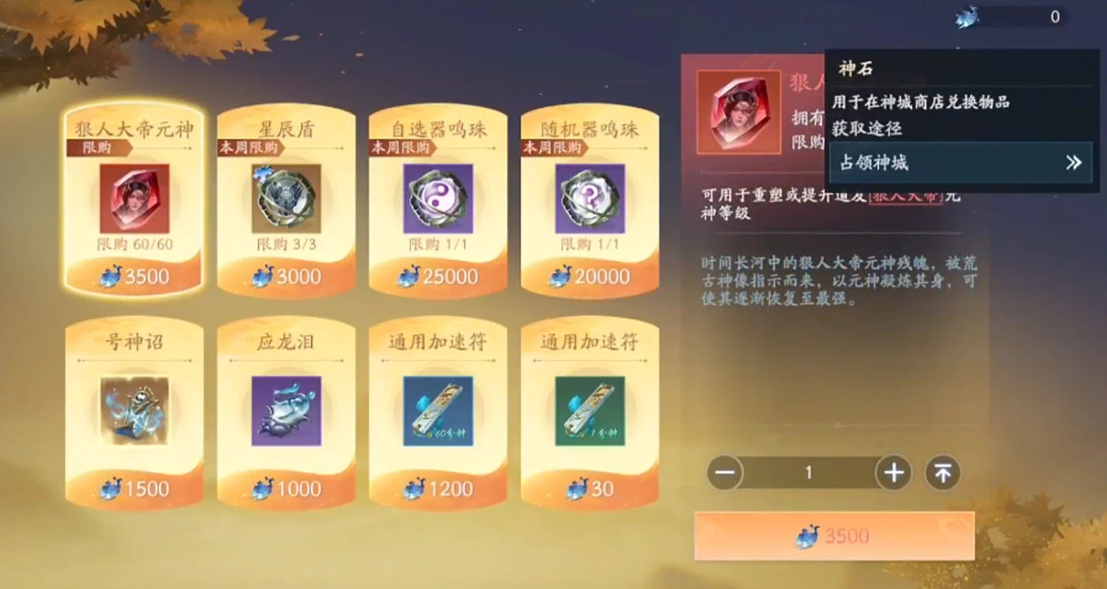神石为稀有战略资源,仅可通过占领并驻守神城获得,不可通过其他途径补充。其核心用途具有唯一性:用于兑换红色品质角色“狠ren大帝”的元神,以及高品质器明珠——后者是法宝进阶不可或缺的关键材料。