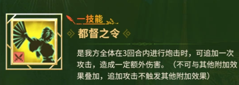 在游戏设定中,她奉大明朝廷之命开启西向远航任务,肩负外交使节与贸易开拓双重使命。其一技能【都督之令】可使己方全体单位在连续3回合内发动炮击时,额外追加一次基础炮击伤害;该追加攻击不与其他增益效果叠加,且不会触发任何二次效果(如暴击判定、状态附加等)。