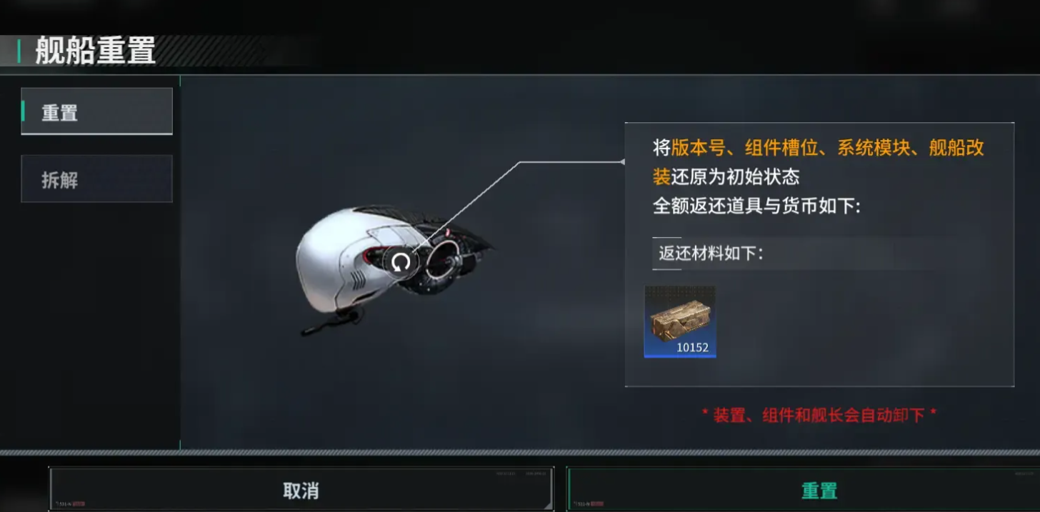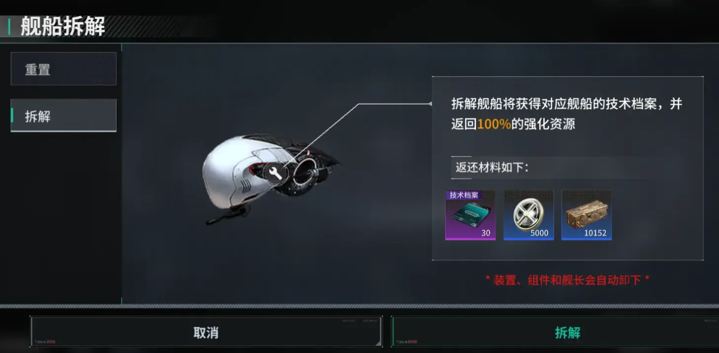该界面提供两个选项:“重置”与“拆解”。选择“重置”,系统将还原舰船所有改装槽位、系统模块及舰体强化状态,并返还基础材料与通用组件;而选择“拆解”,除返还全部材料外,还将额外授予该舰船专属的“技术档案”,用于解锁对应舰种的进阶研发线。