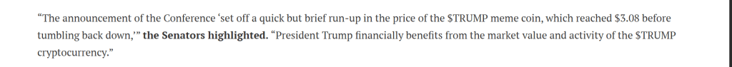 三位民主党参议员——伊丽莎白·沃伦、理查德·布卢门撒尔和亚当·希夫——向TRUMP迷因币发起人比尔·赞克尔发出信函,要求确认总统是否真计划现身。