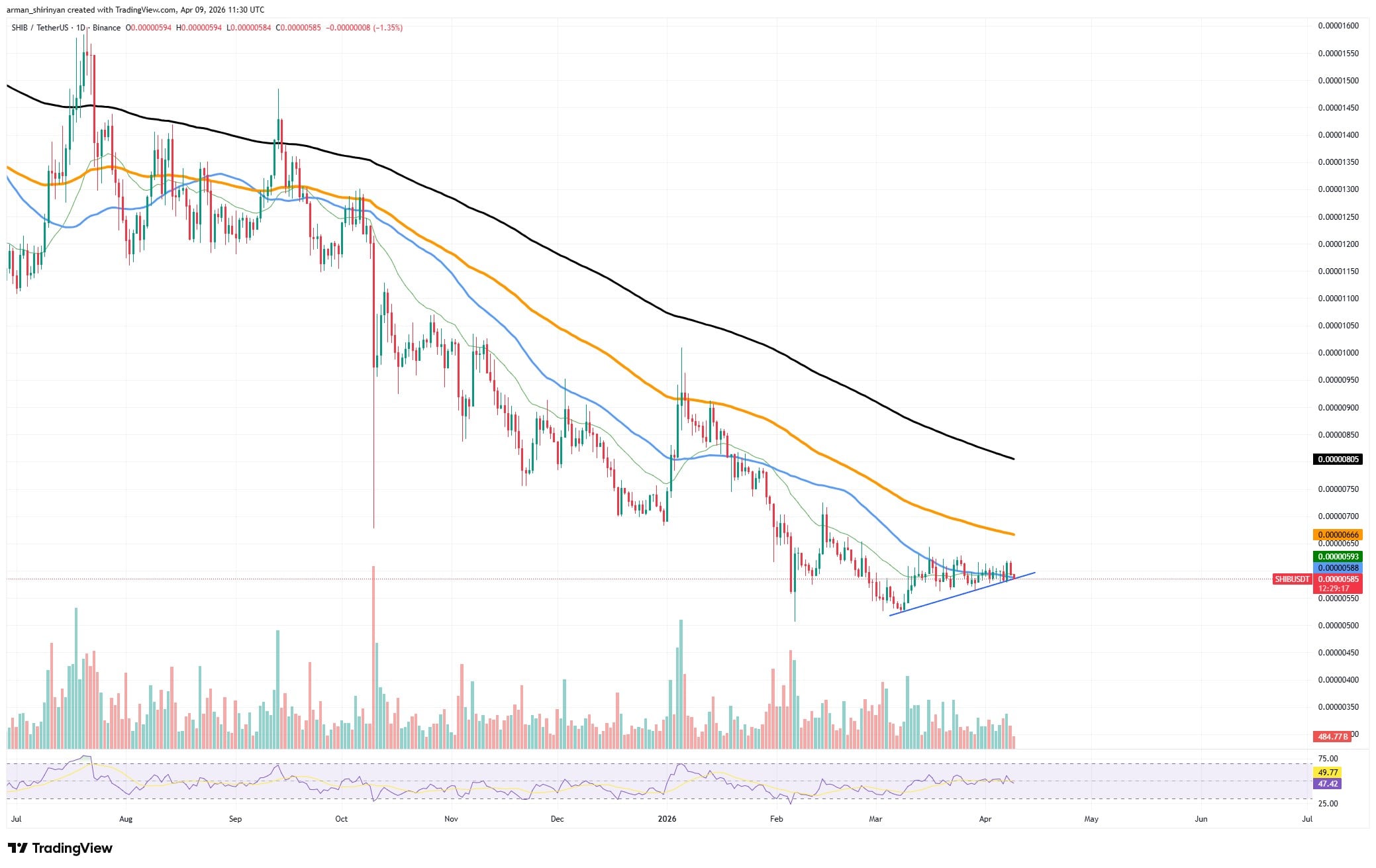这种停滞直接体现在SHIB的价格走势上。经历长期下跌后,该资产进入弱势盘整阶段,仅形成浅薄的上升结构。尽管低点逐步抬高看似积极信号,但整体格局依然看跌。所有关键移动平均线仍保持下行趋势,持续压制任何上涨尝试。