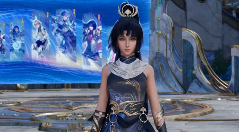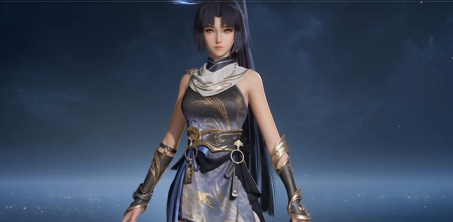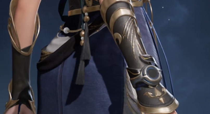 主体服饰为不对称剪裁的古风长裙,融合现代渲染技术实现黑金渐变过渡,衣摆与袖缘保留传统纹样逻辑,同时强化动态光影表现。袖部结构特别优化,手环与袖套形成视觉一体化设计,避免配件外露造成的割裂感,显著提升整体穿搭协调度。