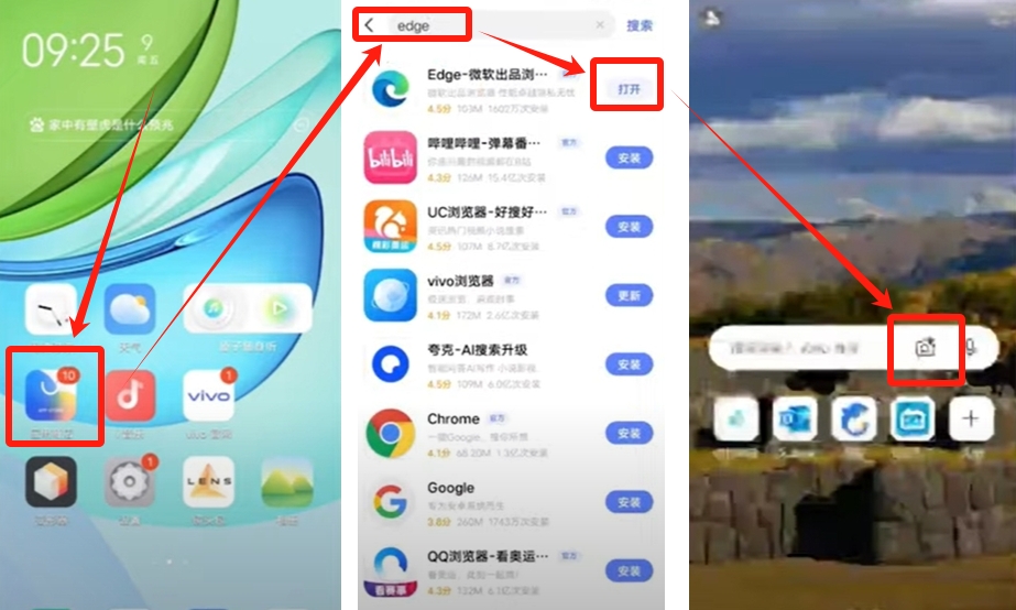 首先我们打开支付宝,没有支付宝的可以通过应用商店下载微软浏览器edge,这里我用下载edge的方式给大家展开。打开应用商店,搜索edge,我这里hi下载好的了,没有下载的可以点击下载。