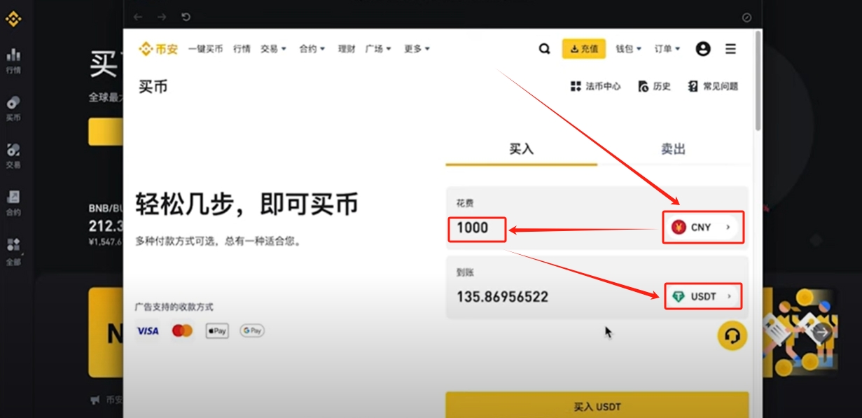 首页点击"立即购买"进入交易界面,中国用户需注意法定货币交易品种限制。建议新手优先选择USDT作为基础交易对。