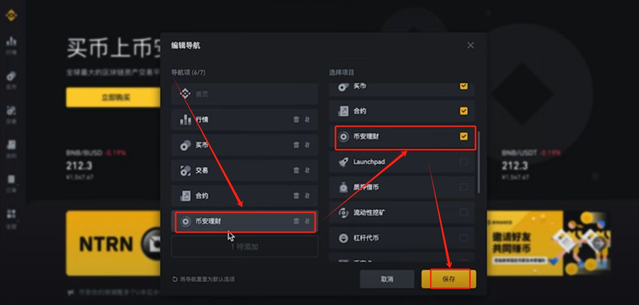 例如将"币安理财"功能置顶,删除不常用的"订单"模块,保存后即可优化工作区布局。