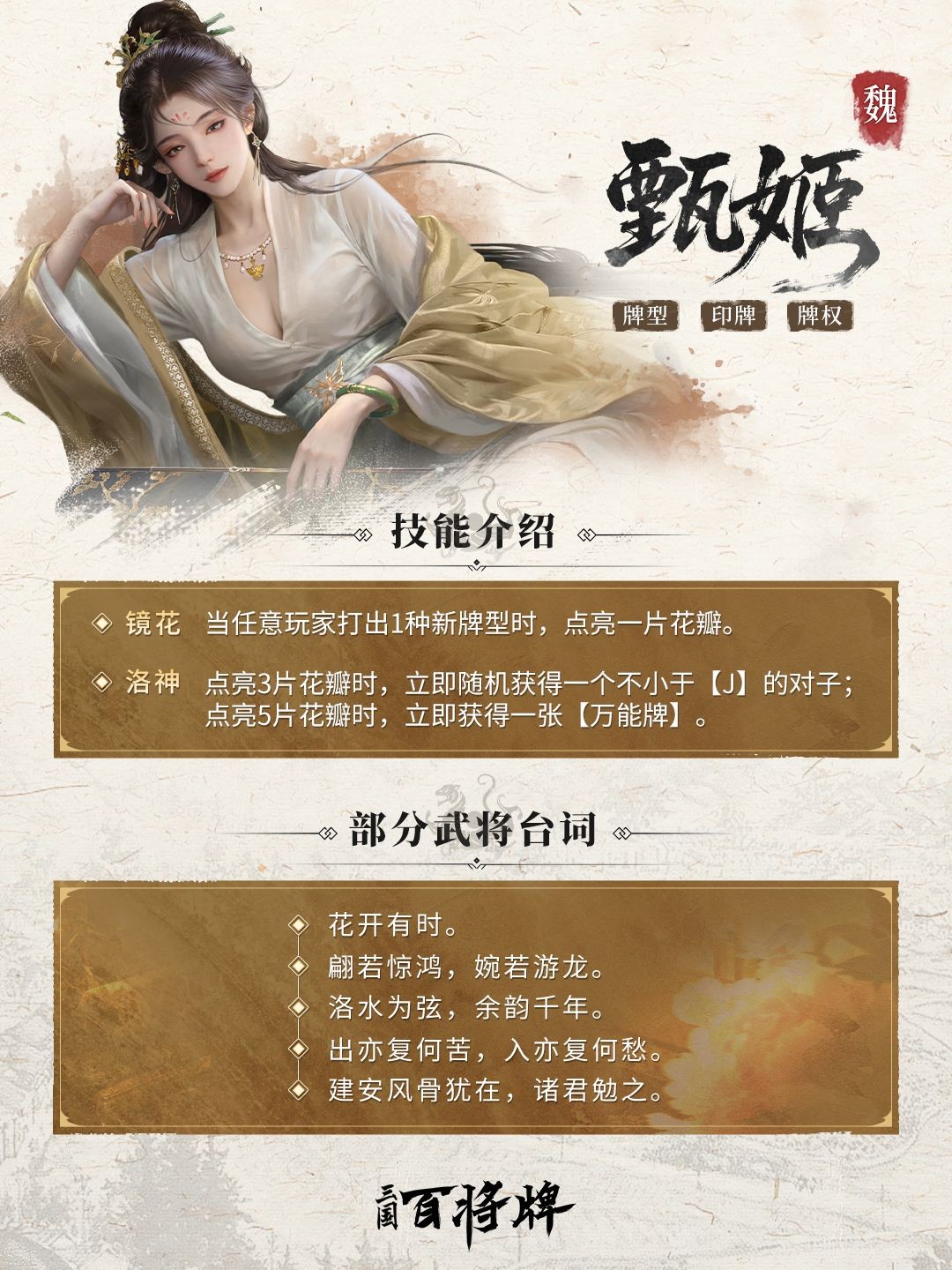 甄姬乃三国闻名的温婉佳人,传闻,曹植一曲《洛神赋》便是在道尽她的绝代风华。这份神女气韵,在《三国:百将牌》中化作【镜花】【洛神】双技,以花瓣为引,于牌局中步步生华。