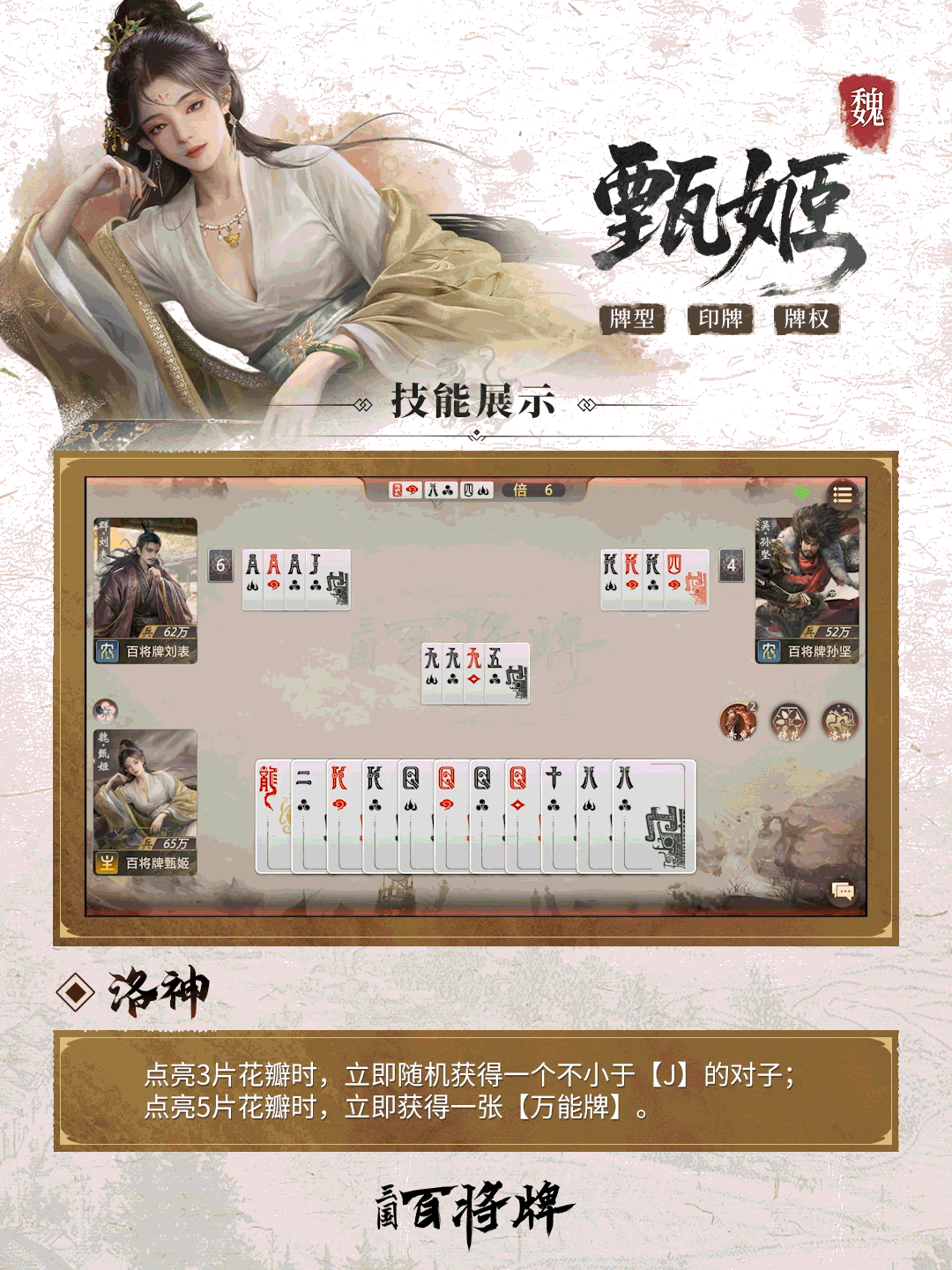 前期尽量主导牌权,每一轮自己打出不同牌型,快速点亮3片花瓣触发【洛神】技能,避免增加无效手牌。
