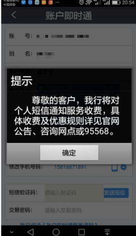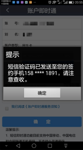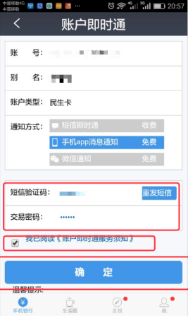 5、在接收短信的提示,“确定”一下,把收到的短息验证码填写,把交易密码也填写,并勾选“我已阅读...”,最后“确定”,具体如下图