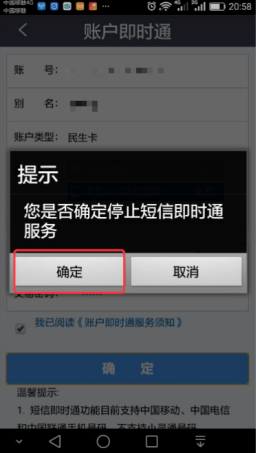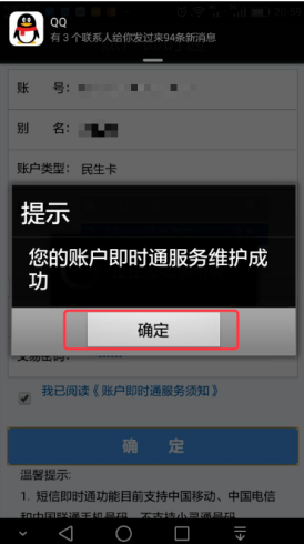 6、接下提示“您是否停止短信即时通服务”,“确定”即可,随后弹出提示“您的账户即时通服务维护成功”,说明停用成功,直接确定即可,具体如下图