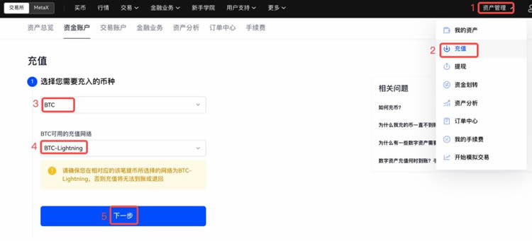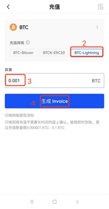 在官网资产管理页面选择BTC-Lightning通道,填写充值金额后生成Invoice。该凭证可用于其他平台的提现操作。