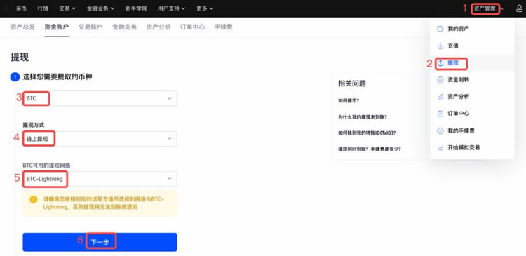 通过资产管理的提现入口,选择BTC-Lightning通道并输入收款方提供的Invoice信息。确认金额和手续费后即可提交请求。