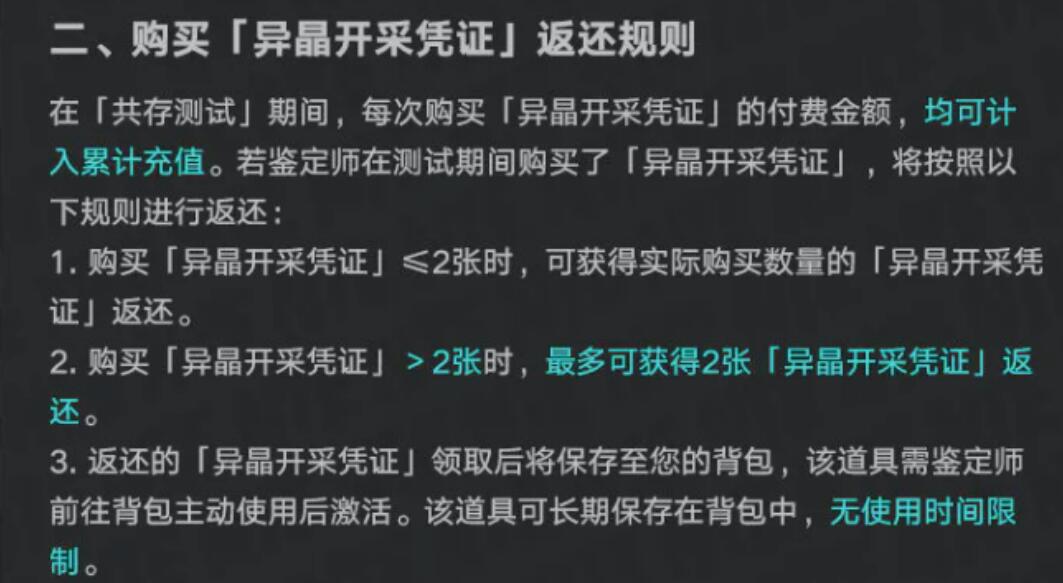 “异晶开采凭证”即玩家所称的通行证,采用“现金+道具”双轨返还机制。用户实际支付的凭证费用,全部计入账号累计充值总额,并依据异晶换算规则统一结算。道具返还方面设有数量上限:每个账号最多可获得2张返还凭证;若测试期间购买1张,即返还1张;购买3张或以上,仍仅返还1张。返还所得凭证将直接发放至背包,无存放时限限制;激活后有效期为30天,在此期间可完整领取对应全部权益。