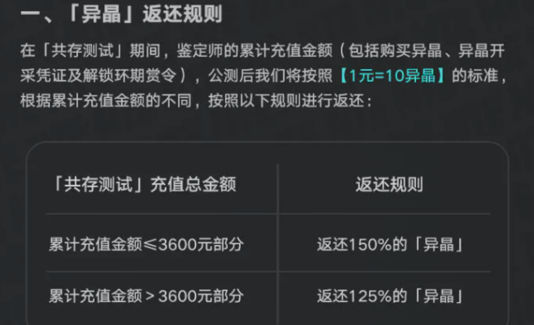异晶返还为本次政策的核心计算方式。游戏内统一按1元=10异晶进行基础换算,并实行阶梯式返还比例:累计充值金额≤3600元部分,返还比例为150%;超出3600元的部分,返还比例为125%。无论充值规模大小,所有测试用户均可按该标准获得相应异晶返还,确保投入价值得到充分保障。