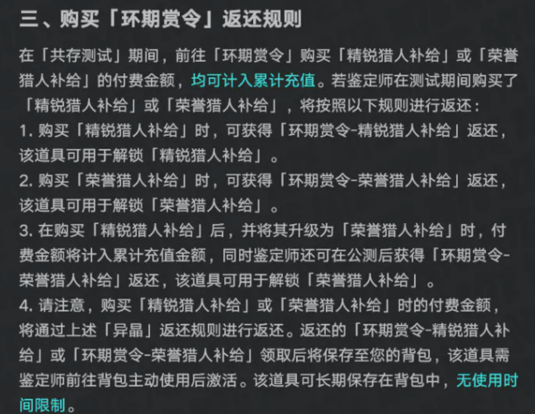 战令类商品(如精锐猎人补给、荣耀猎人补给)同样纳入返还范围,其购买费用计入总充值额,公测开启后将以1:1比例返还对应战令道具。返还道具将存入背包,长期有效,但需玩家手动激活方可使用。返还后的战令权益与测试期完全一致,上线当日即可解锁高阶奖励内容,显著提升初期游戏体验连贯性与成长效率。