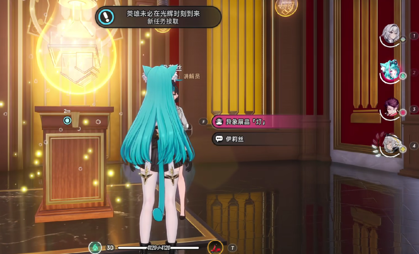 任务起始点位于新赫兰德区的钨丝展厅。进入场馆后,在一层中央讲台附近可找到NPC金苹果场馆讲解员伊莉丝,与其对话即可触发任务“英雄未必在光辉时刻到来”。随后需下至展厅负一层,与钨丝相关NPC交谈,了解事件背景;待任务阶段更新后,自动引导至城市公园场景,聆听角色“光辉”的口述回忆,并正式进入其记忆空间。