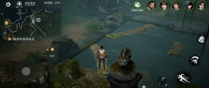 首道核心关卡聚焦于蛇形雕像机关系统。遗迹内分布的石雕实为水路调控枢纽,目标锁定右侧蛇形雕像。通过旋转浮木方向驱动其位移,当两根浮木呈标准“八”字构型时,一条稳固通行路径随即生成。抵达对岸石台后,第二座蛇形雕像即刻显现。向左旋转该雕像触发机关,石台底部将自动升起两级台阶与一根独立悬浮木桩。依序踏阶下行、跃上浮木,即可抵达左侧新石台。