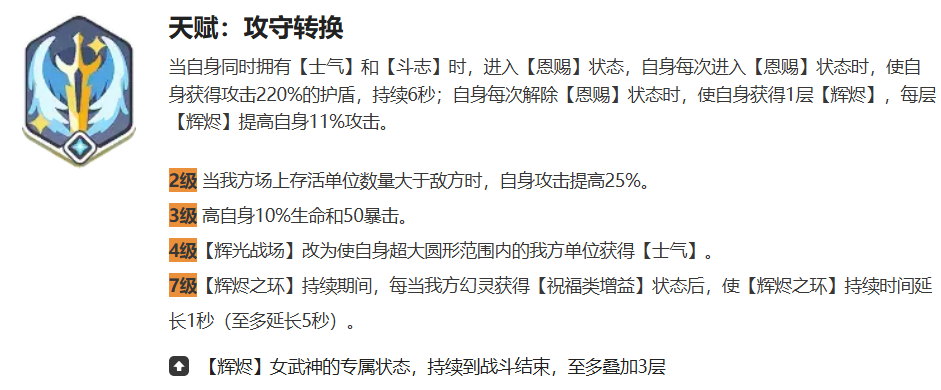 天赋系统提供多阶成长路径:2级天赋在己方存活人数多于敌方时,直接提升25%攻击力;3级增加10%生命上限与50点暴击属性;4级优化绝技“辉光战场”,由原仅赋予自身士气,升级为超大范围队友全体施加士气;7级强化奥义“辉烬之环”,每当友方单位获得祝福类增益时,该技能持续时间延长1秒,最多延长5秒。