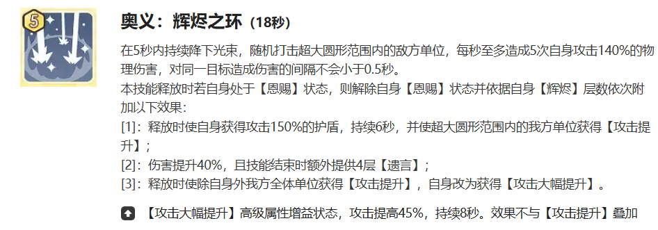 若在恩赐状态下释放该奥义,将主动解除恩赐,并依据当前辉烬层数触发差异化强化效果:1层时,生成攻击力150%的护盾(持续6秒),并为范围内队友附加攻击提升;2层时,奥义总伤害提升40%,技能结束时额外赋予4层“遗言”;3层时效果最强,除布伦希尔德自身获得持续8秒、提升45%攻击力的强力增幅外,其余所有队友同步获得攻击提升效果。