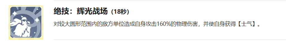 绝技“辉光战场”同样拥有18秒冷却,对较大圆形区域敌人造成攻击力160%的物理伤害,并使自身获得士气状态。该技能与天赋协同性极强,是快速触发恩赐状态的关键前置手段。
