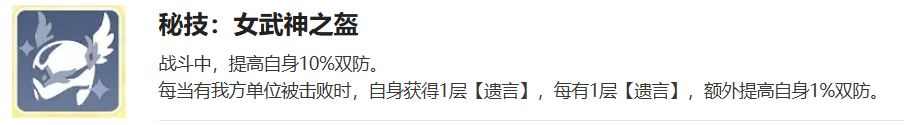 被动技能“女武神之盔”提供常驻10%双防加成;每当有友方单位被击败,布伦希尔德额外获得1层“遗言”,每层提升1%双防。该机制在逆风战局中尤为关键,随战损扩大而持续强化生存能力。