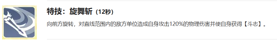 特技“旋舞斩”冷却12秒,向前方直线范围发动旋转攻击,造成攻击力120%的物理伤害,并赋予自身“斗志”。该技能是构建士气+斗志组合、激活恩赐状态的核心节奏节点。