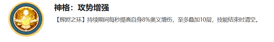 神格被动“攻势增强”专注爆发输出:在“辉烬之环”持续期间,每秒叠加1层、共10层的奥义增伤效果,每层提升8%,满层可达80%奥义伤害加成。该增益在技能结束后清空,需配合精准的技能释放节奏以实现最大化收益。