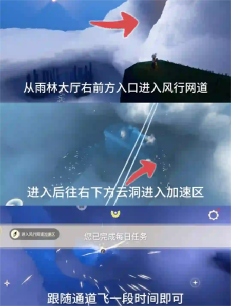 从雨林大厅右前方云洞进入风行网道,进入后往右前方云洞进入加速区,在加速区通道飞一段时间即可