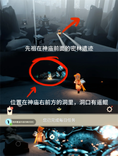 进入密林遗迹后,直接往前面前面的水池飞,先祖位置在右侧的山洞里,洞口有一只遥鲲