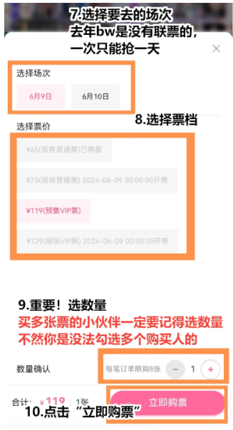 6. 选定场次、票种及数量后点击购票按钮