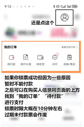 8. 未及时支付的订单可在"待付款"列表续费,锁票时限约10分钟
