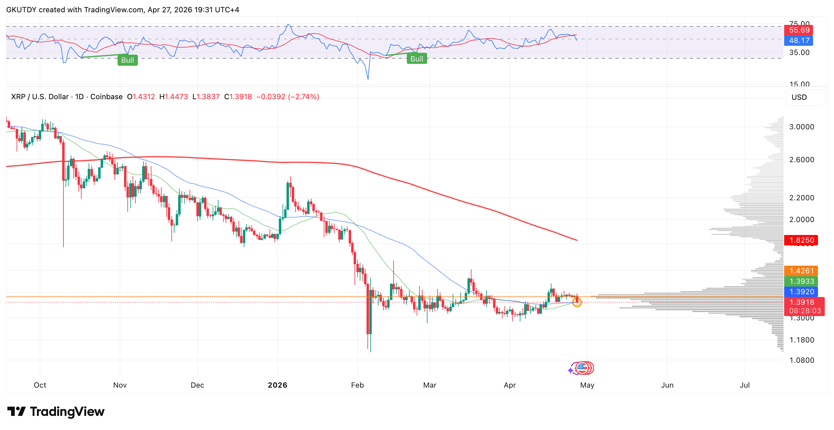 鉴于XRP当前市价1.4037美元,现价与长期趋势线之间存在精确的30%技术缺口。技术分析中,此类缺口在确认看涨动能后往往成为"磁吸"目标。