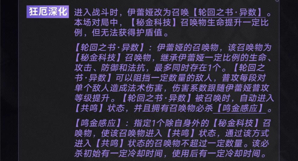 1、狂厄深化可让自身召唤物轮回之书开场时,及释放召唤物必杀时令友方秘金召唤物共鸣,召唤物必杀冷却可通过专烙缩短。