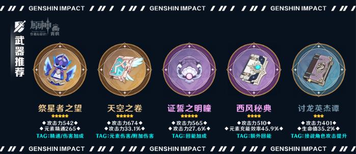 3、武器优先选祭星者之望或天空之卷,备选证誓之明瞳西风秘典,过渡可选讨龙英杰谭提升队伍输出。