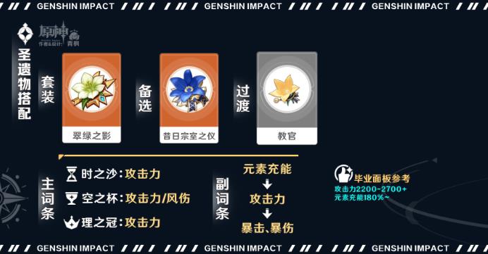 4、圣遗物主选翠绿之影套装,备选昔日宗室之仪,过渡用教官套,词条优先攻击力风伤充能暴击暴伤。